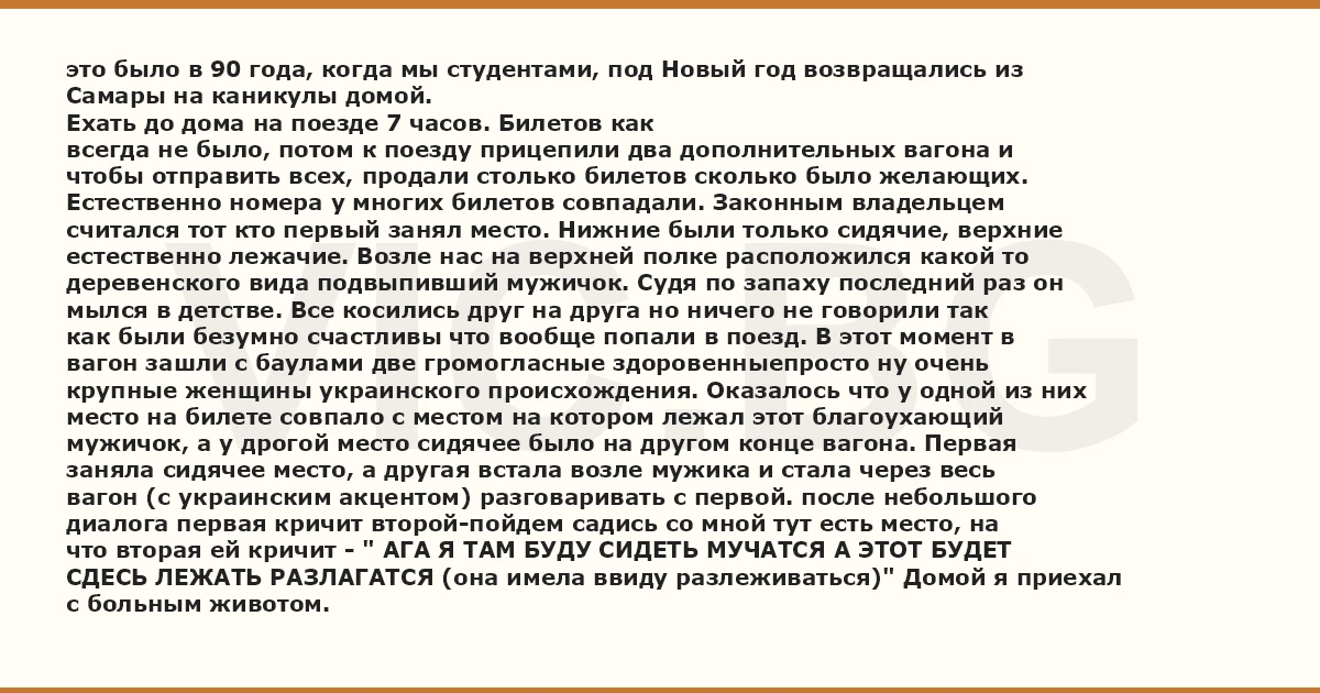 это было в 90 года, когда мы студентами, под Новый год возвращались из Самары на каникулы домой. Ехать до дома на поезде 7 часов. Билетов как всегда не было, потом к поезду прицепили два дополнительных вагона и чтобы отправить всех, продали столько билетов сколько было желающих. Естественно номера у многих билетов совпадали. Законным владельцем считался тот кто первый занял место. Нижние были только сидячие, верхние естественно лежачие. Возле нас на верхней полке расположился какой то деревенского вида подвыпивший мужичок. Судя по запаху последний раз он мылся в детстве. Все косились друг на друга но ничего не говорили так как были безумно счастливы что вообще попали в поезд. В этот момент в вагон зашли с баулами две громогласные здоровенныепросто ну очень крупные женщины украинского происхождения. Оказалось что у одной из них место на билете совпало с местом на котором лежал этот благоухающий мужичок, а у дрогой место сидячее было на другом конце вагона. Первая заняла сидячее место, а другая встала возле мужика и стала через весь вагон (с украинским акцентом) разговаривать с первой. после небольшого диалога первая кричит второй-пойдем садись со мной тут есть место, на что вторая ей кричит - " АГА Я ТАМ БУДУ СИДЕТЬ МУЧАТСЯ А ЭТОТ БУДЕТ СДЕСЬ ЛЕЖАТЬ РАЗЛАГАТСЯ (она имела ввиду разлеживаться)" Домой я приехал с больным животом.