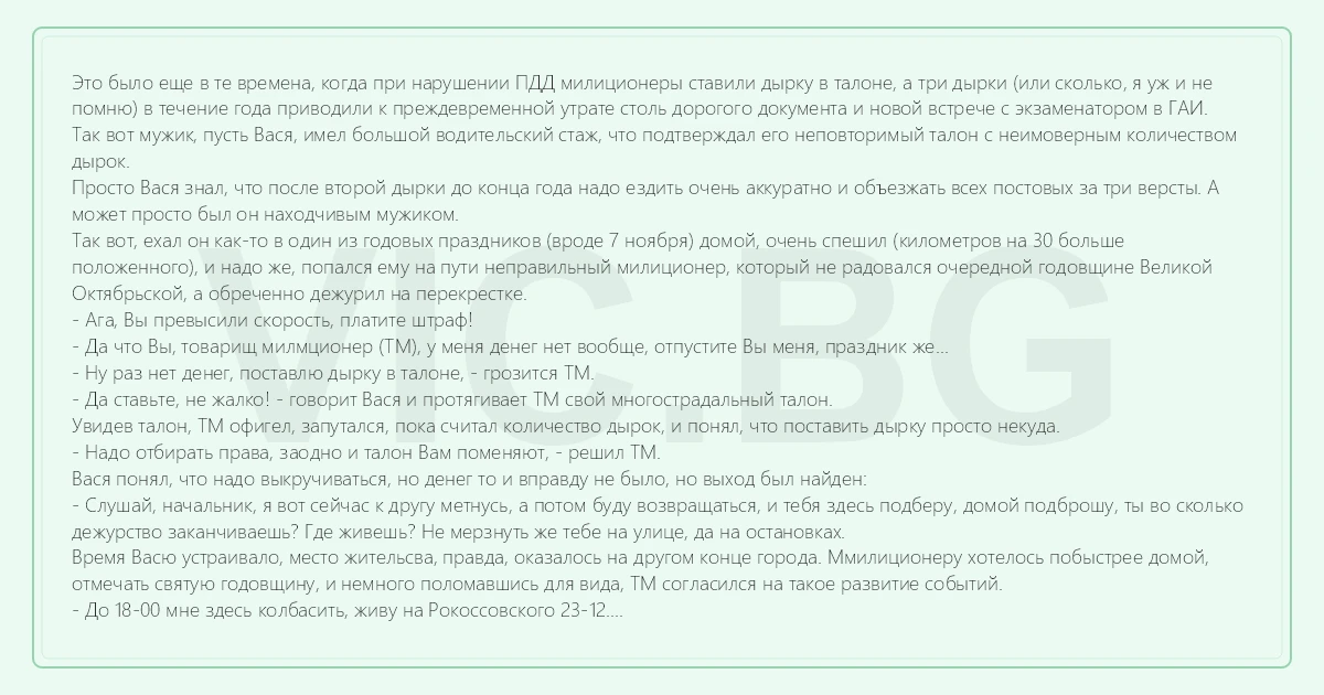 Так вот мужик, пусть Вася, имел большой водительский стаж, что подтверждал его неповторимый талон с неимоверным количеством дырок.
