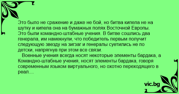 Это были командно-штабные учения. В битве сошлись два генерала, им намекнули, что победитель первым получит следующую звезду на зигзаг и генералы суетились не по детски, напрягнув при этом все связи.
