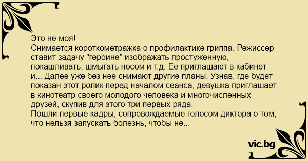 Это не моя! Снимается короткометражка о профилактике гриппа. Режиссер ставит задачу "героине" изображать простуженную, покашливать, шмыгать носом и т.д. Ее приглашают в кабинет и... Далее уже без нее снимают другие планы. Узнав, где будет показан этот ролик перед началом сеанса, девушка приглашает в кинотеатр своего молодого человека и многочисленных друзей, скупив для этого три первых ряда. Пошли первые кадры, сопровождаемые голосом диктора о том, что нельзя запускать болезнь, чтобы не прибегать к экстренным мерам... В это время на экране показывают больную девушку, которую приглашают в кабинет... "Это не моя", - истошно кричит девушка, потому что следующим кадром во весь экран показывают обнаженную ж*пу, куда сейчас врач сделает укол.