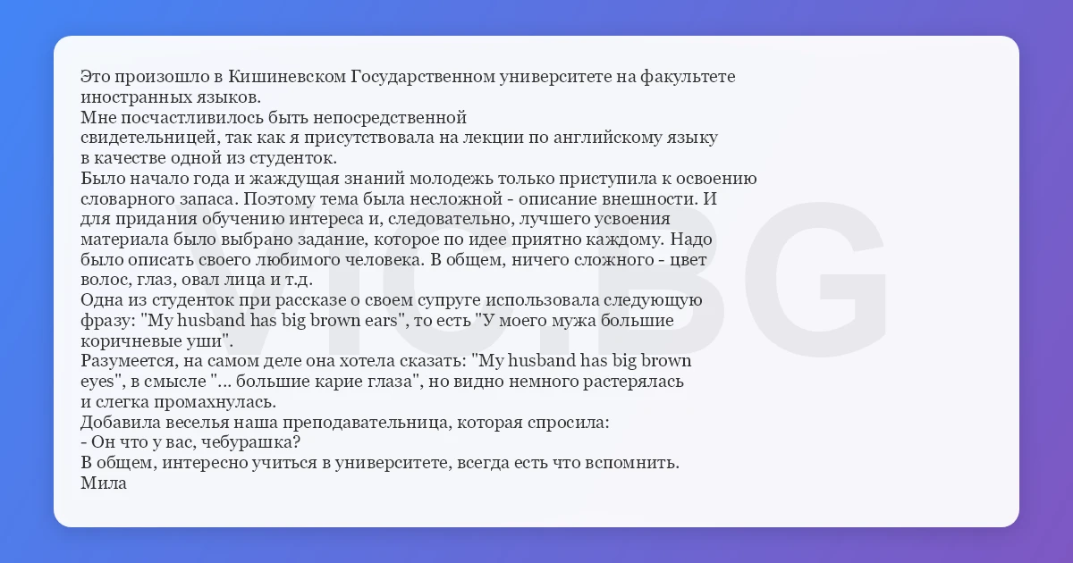 Это произошло в Кишиневском Государственном университете на факультете иностранных языков. Мне посчастливилось быть непосредственной свидетельницей, так как я присутствовала на лекции по английскому языку в качестве одной из студенток. Было начало года и жаждущая знаний молодежь только приступила к освоению словарного запаса. Поэтому тема была несложной - описание внешности. И для придания обучению интереса и, следовательно, лучшего усвоения материала было выбрано задание, которое по идее приятно каждому. Надо было описать своего любимого человека. В общем, ничего сложного - цвет волос, глаз, овал лица и т.д. Одна из студенток при рассказе о своем супруге использовала следующую фразу: "My husband has big brown ears", то есть "У моего мужа большие коричневые уши". Разумеется, на самом деле она хотела сказать: "My husband has big brown eyes", в смысле "... большие карие глаза", но видно немного растерялась и слегка промахнулась. Добавила веселья наша преподавательница, которая спросила: - Он что у вас, чебурашка? В общем, интересно учиться в университете, всегда есть что вспомнить. Мила