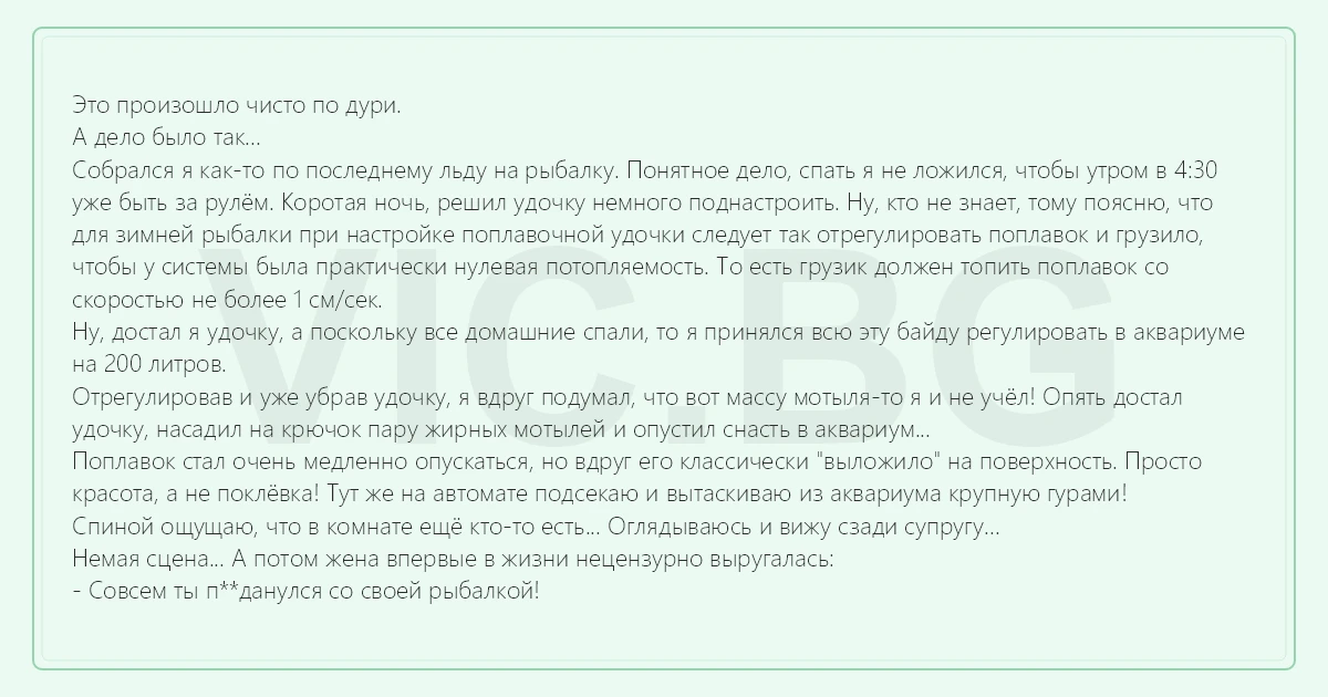 Это произошло чисто по дури. А дело было так... Собрался я как-то по последнему льду на рыбалку. Понятное дело, спать я не ложился, чтобы утром в 4:30 уже быть за рулём. Коротая ночь, решил удочку немного поднастроить. Ну, кто не знает, тому поясню, что для зимней рыбалки при настройке поплавочной удочки следует так отрегулировать поплавок и грузило, чтобы у системы была практически нулевая потопляемость. То есть грузик должен топить поплавок со скоростью не более 1 см/сек. Ну, достал я удочку, а поскольку все домашние спали, то я принялся всю эту байду регулировать в аквариуме на 200 литров. Отрегулировав и уже убрав удочку, я вдруг подумал, что вот массу мотыля-то я и не учёл! Опять достал удочку, насадил на крючок пару жирных мотылей и опустил снасть в аквариум... Поплавок стал очень медленно опускаться, но вдруг его классически "выложило" на поверхность. Просто красота, а не поклёвка! Тут же на автомате подсекаю и вытаскиваю из аквариума крупную гурами! Спиной ощущаю, что в комнате ещё кто-то есть... Оглядываюсь и вижу сзади супругу... Немая сцена... А потом жена впервые в жизни нецензурно выругалась: - Совсем ты п**данулся со своей рыбалкой!