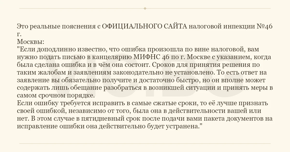 "Если доподлинно известно, что ошибка произошла по вине налоговой, вам нужно подать письмо в канцелярию МИФНС 46 по г. Москве с указанием, когда была сделана ошибка и в чём она состоит. Сроков для принятия решения по таким жалобам и заявлениям законодательно не установлено. То есть ответ на заявление вы обязательно получите и достаточно быстро, но он вполне может содержать лишь обещание разобраться в возникшей ситуации и принять меры в самом срочном порядке.
