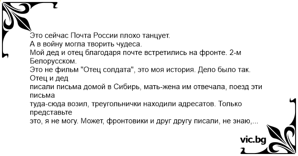 Это сейчас Почта России плохо танцует. А в войну могла творить чудеса. Мой дед и отец благодаря почте встретились на фронте. 2-м Белорусском. Это не фильм "Отец солдата", это моя история. Дело было так. Отец и дед писали письма домой в Сибирь, мать-жена им отвечала, поезд эти письма туда-сюда возил, треугольнички находили адресатов. Только представьте это, я не могу. Может, фронтовики и друг другу писали, не знаю, передаю, что моя мать мне со слов отца рассказала. Он о войне, как и все, не любил вспоминать. И вот отец с сыном намёками (никаких названий! военная тайна!) рассказывали, где воюют. Получалось близко. Ещё ближе. Рядом. И вот сын отпросился у командира, надел винтовку на плечо и пошёл искать отца. Боевое охранение той части его остановило, винтовку отобрали, посадили его в яму. Когда пришёл отец, сына из ямы, конечно, выпустили, и дали им водки. Выпили они и написали вместе письмо домой, почту работой загрузили. Предки мои – везунчики: дед слух терял от контузии, всего-навсего. Отец слышал свою фамилию "…ва убило!", а его землёй завалило, всего-навсего. А после войны появился я. Вечная память и вечная слава нашим отцам и дедам!