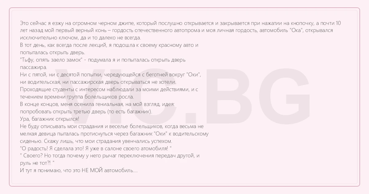 Это сейчас я езжу на огромном черном джипе, который послушно открывается и закрывается при нажатии на кнопочку, а почти 10 лет назад мой первый верный конь – гордость отечественного автопрома и моя личная гордость, автомобиль "Ока", открывался исключительно ключом, да и то далеко не всегда. В тот день, как всегда после лекций, я подошла к своему красному авто и попыталась открыть дверь. "Тьфу, опять заело замок" - подумала я и попыталась открыть дверь пассажира. Ни с пятой, ни с десятой попытки, чередующейся с беготней вокруг "Оки", ни водительская, ни пассажирская дверь открываться не хотели. Проходящие студенты с интересом наблюдали за моими действиями, и с течением времени группа болельщиков росла. В конце концов, меня осенила гениальная, на мой взгляд, идея: попробовать открыть третью дверь (то есть багажник). Ура, багажник открылся! Не буду описывать мои страдания и веселье болельщиков, когда весьма не мелкая девица пыталась протиснуться через багажник "Оки" к водительскому сиденью. Скажу лишь, что мои страдания увенчались успехом. "О радость! Я сделала это! Я уже в салоне своего атомобиля! " " Своего? Но тогда почему у него рычаг переключения передач другой, и руль не тот?! " И тут я понимаю, что это НЕ МОЙ автомобиль....