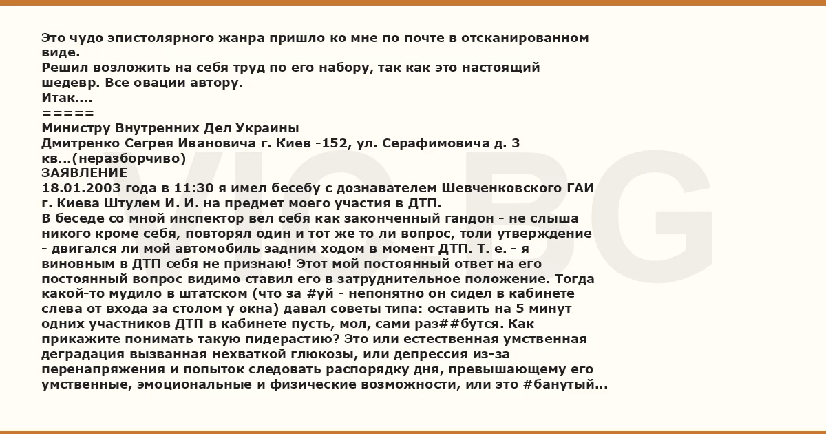 Это чудо эпистолярного жанра пришло ко мне по почте в отсканированном виде. Решил возложить на себя труд по его набору, так как это настоящий шедевр. Все овации автору. Итак.... ===== Министру Внутренних Дел Украины Дмитренко Сегрея Ивановича г. Киев -152, ул. Серафимовича д. 3 кв...(неразборчиво) ЗАЯВЛЕНИЕ 18.01.2003 года в 11:30 я имел бесебу с дознавателем Шевченковского ГАИ г. Киева Штулем И. И. на предмет моего участия в ДТП. В беседе со мной инспектор вел себя как законченный гaндoн - не слыша никого кроме себя, повторял один и тот же то ли вопрос, толи утверждение - двигался ли мой автомобиль задним ходом в момент ДТП. Т. е. - я виновным в ДТП себя не признаю! Этот мой постоянный ответ на его постоянный вопрос видимо ставил его в затруднительное положение. Тогда какой-то мудило в штатском (что за #уй - непонятно он сидел в кабинете слева от входа за столом у окна) давал советы типа: оставить на 5 минут одних участников ДТП в кабинете пусть, мол, сами раз##бутся. Как прикажите понимать такую пидерастию? Это или естественная умственная деградация вызванная нехваткой глюкозы, или депрессия из-за перенапряжения и попыток следовать распорядку дня, превышающему его умственные, эмоциональные и физические возможности, или это #банутый стиль работы Шевченковского ГАИ. На мою просьбу написать мне свои данные - фамилию, должность инспектор скривил свое #бало, швырнул ручку и бумагу и предложил сделать это самому. Для меня, человека тонкой душевной организации, такое отношение государственного служащего неприемлимо. Я не требую от инспектора чтобы он в беседе со мной был застенчивый как #уй на морозе, но и вести себя нагло как танк никому не позволю. Я требую разбирательства в рамках закона! Почему мне не дали копии документов как я того просил? Инспектор пи#дел какую-то #уйню и ссылаясь на ст. 121 УПК Украины отказывался дать мне копии документов. В ст. 121 УПК я нигде не нашел запрета на получение копий объяснительных, схему места ДТП. С каких это пор объяснительные и схема ДТП стали результатами предварительного следствия? Как известно дуpak бывает таким, что рядом с ним чувствуешь себя идиотом. Какое у него образование? Кто за ним стоит и кому это выгодно такое пи#доватое отношение к работе? Юридические знания не заменишь голосовыми данными и искусной жестикуляцией и как бы он не хмурил брови и не морщил лоб - такой перекос лица меня не убеждает. Надо проверить и другие подобные дела, которые вел инспектор Штуль, а также начальника Шевченковского ГАИ - ведь какая-то #лядь назначила Штуля дознователем с правом решать судьбы людей. Один такой сотрудник, который выгодно отличается от хороших людей, заменяет десять ихних террористов. Я тут жопу рву стараясь наполнить бюджет, уже и матня вся седая, а какие-то рас#издяи делают бездоказательные заявления, которые могут лишить меня кровно заработанных. Общаясь к сотрудниками МВД могу сделать неутешительный вывод: враждебные элементы проникли в МВД, это конечно отдельные элементы, но они составляют в МВД большинство. Действия инспектора Штуля И. И. я нахожу предвзятыми и некомпетентными, а так как он является служащим, принятым на службу государством от моего имени, то прошу уволить его из органов МВД, а также уволить того советчика из каб.11, который давал советы Штулю 18.01.03г. Отдельно требую выдать мне копии объяснительных и схе