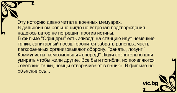 Эту историю давно читал в военных мемуарах. В дальнейшем больше нигде не встречал подтверждения. надеюсь автор не погрешил против истины. В фильме "Офицеры" есть эпизод: на станцию идут немецкие танки, санитарный поезд торопится забрать раненых, часть легкораненых организовывают оборону. Гранаты, лозунг " Коммунисты, комсомольцы - вперёд!" Люди сознательно шли умирать чтобы жили другие. Все бы и погибли, но появляются советские танки, немцы отворачивают в панике. В фильме не объяснялось откуда и как взялись наши танки, может посчитали что главное массовый подвиг советских солдат показать, может не смогли бы практически это продемонстрировать: компьютерной графики не было, съёмки были натурные, а такое демонстрировать в мирное время, погоны сорвут даже с маршала... Что было вне экрана. Февраль 1943, Сталинградская группировка немцев окружена. Немцы швыряют танки с Кубани на прорыв к Паулюсу. Наши посередине степи кое-как организовывают оборону - основные силы ещё под Сталинградом душат котёл. Немецкая авиаразведка проходит над степью - чисто почти - немного пехоты, даже артиллерии нет. Приказ танкам в направлении станции можно наступать. Через пару часов в радиоэфире паника - мы горим! Фланговый удар русских танков! С лётчиками разборки на уровне гестапо - в степи зимой проглядеть танки не возможно! Это предательство рейха! Что было в реальности. За пару часов до того танков НЕ БЫЛО. Ни единого. Были раненые и остатки пехоты. На станцию влетел санитарный поезд и начал погрузку. Полуживые люди взялись за гранаты прикрывать остальных А тем временем чья та неразумная, но как оказалось для всех удачливая головушка отправила вслед за санитарным поездом эшелон с платформами - танковый батальон, может меньше, не знаю сколько по тем временам один паровоз мог уволочь за собой тяжело гружёных платформ. Состав на станцию войти не смог: путь забит санитарным. В тех краях до 90-х в большинстве случаев ещё была одноколейка. Может сейчас что и сменилось,но тогда состав встал на подходе к станции в степи. Для разгрузки танков по всем положениям нужна возвышенность - станционная платформа и мостки что бы по ним сползти. В теории. А на практике - степь, танки задраны на высоту платформ и насыпи. В 1941 у нас так немцы эшелоны целые неразгруженной техники захватывали, а то просто сжигали. Но это был уже 1943, люди не те, уставы и положения соблюдали при условии - не мешает бить врага, а иначе - поеб... Если удавалось разбить врага, никто не награждал, но и не давил, если нет - трибунал. как говорится - думайте сами, решайте сами. Технику угробите на платформах или... Комбат решил или. Приказ: из танков боезопас долой. Минут 15 и вытащили. Экипажам покинуть машины, смотреть. Комбат сам за водителя садится, поворот на 90 градусов на платформе - танк (НЕ БТшка, а т-34!), 27 тонн - прыгает вниз с высоты не менее 2-х метров. Видели? Механикам - водителя - делай как я! По исполнении боезопас загрузить! Минут за сорок батальон готов к маршу. Две машины перевернулись на бок - оставили одну дёргать их тросами, остальные вперёд. Высаживались в стороне от станции - в результате вышли во фланг наступающим немцам. Борта немецких Т4 из орудий тридцатьчетвёрки прошивались хорошо + неожиданность. Немцев уверяли что это будет прогулка гусеницами по пехоте, а это оказалось избиение. Хотелось самим жить, на 