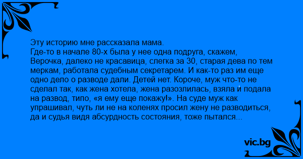 Где-то в начале 80-х была у нее одна подруга, скажем, Верочка, далеко не красавица, слегка за 30, старая дева по тем меркам, работала судебным секретарем. И как-то раз им еще одно дело о разводе дали. Детей нет. Короче, муж что-то не сделал так, как жена хотела, жена разозлилась, взяла и подала на развод, типо, «я ему еще покажу!». На суде муж как упрашивал, чуть ли не на коленях просил жену не разводиться, да и судья видя абсурдность состояния, тоже пытался втолковать ей, что зря она это все, но жена ни в какую, развожусь и все. А муж, кстати говоря, был видным мужчиной, высокий, широкоплечий, довольно красивый и работал где-то в хорошем месте. Вот в этих судебных заседаниях-то и положила глаз на него наша Верочка. Вдруг стала и одеваться получше, и прическу сделала модную, похорошела. И не зря, оказывается.