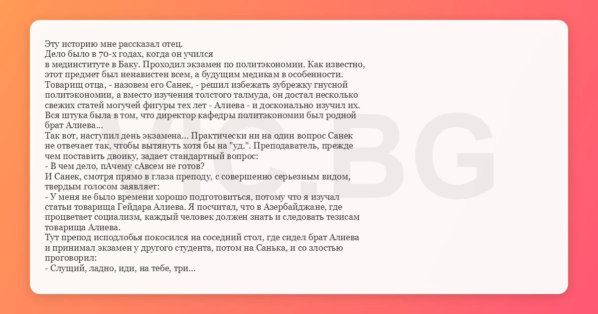Эту историю мне рассказал отец. Дело было в 70-х годах, когда он учился в мединституте в Баку. Проходил экзамен по политэкономии. Как известно, этот предмет был ненавистен всем, а будущим медикам в особенности. Товарищ отца, - назовем его Санек, - решил избежать зубрежку гнусной политэкономии, а вместо изучения толстого талмуда, он достал несколько свежих статей могучей фигуры тех лет - Алиева - и досконально изучил их. Вся штука была в том, что директор кафедры политэкономии был родной брат Алиева... Так вот, наступил день экзамена... Практически ни на один вопрос Санек не отвечает так, чтобы вытянуть хотя бы на "уд.". Преподаватель, прежде чем поставить двоику, задает стандартный вопрос: - В чем дело, пАчему сАвсем не готов? И Санек, смотря прямо в глаза преподу, с совершенно серьезным видом, твердым голосом заявляет: - У меня не было времени хорошо подготовиться, потому что я изучал статьи товарища Гейдара Алиева. Я посчитал, что в Азербайджане, где процветает социализм, каждый человек должен знать и следовать тезисам товарища Алиева. Тут препод исподлобья покосился на соседний стол, где сидел брат Алиева и принимал экзамен у другого студента, потом на Санька, и со злостью проговорил: - Слущий, ладно, иди, на тебе, три...