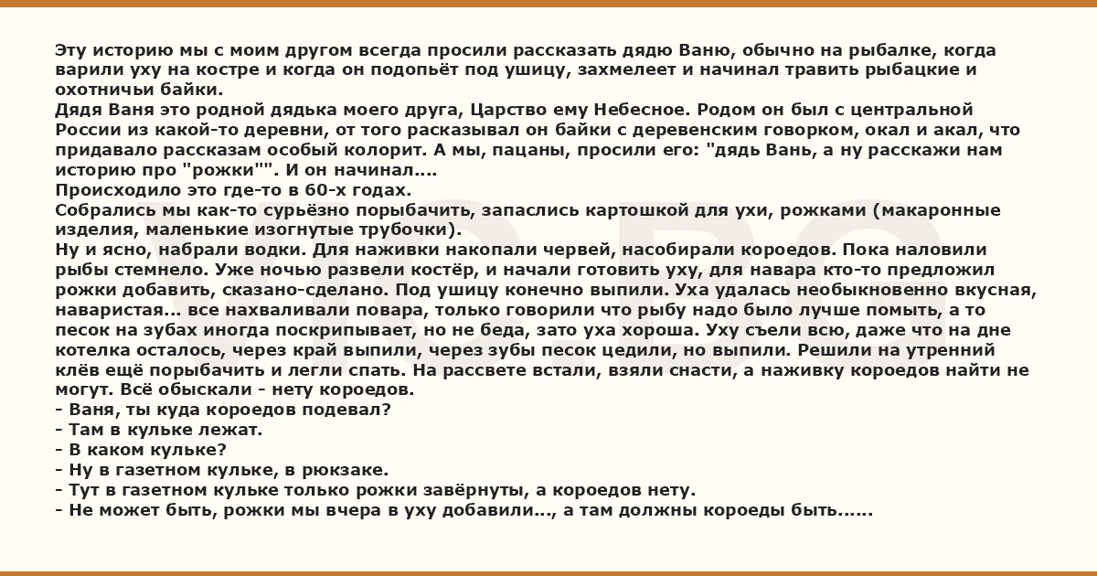 Дядя Ваня это родной дядька моего друга, Царство ему Небесное. Родом он был с центральной России из какой-то деревни, от того расказывал он байки с деревенским говорком, окал и акал, что придавало рассказам особый колорит. А мы, пацаны, просили его: "дядь Вань, а ну расскажи нам историю про "рожки"". И он начинал....