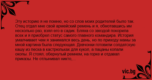 Отец отдал мне свой армейский ремень и я, обмотавшись им несколько раз, взял его в садик. Бляха со звездой покорила всех и я приобрел статус самого главного командира. История умалчивает чем я занимался весь день, но по приходу мамы за мной картина была следующая. Девчонки готовили солдатскую кашу из песка в кастрюльках для кукол, а пацаны копали окопы. Я стоял, обернутый ремнем, на горке и отдавал приказы. Не отлынивал никто, воспитатели не могли нарадоваться на такой коллективный труд.