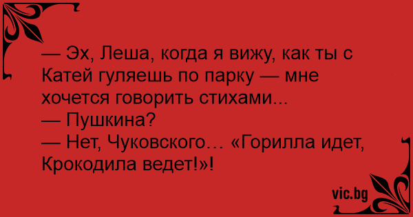 — Эх, Леша, когда я вижу, как ты с Катей гуляешь по парку — мне хочется говорить стихами...