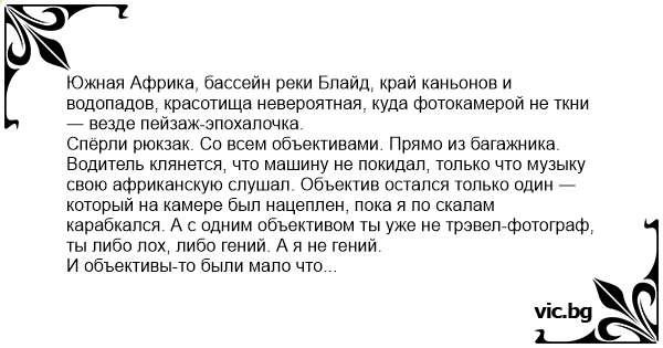 Спёрли рюкзак. Со всем объективами. Прямо из багажника. Водитель клянется, что машину не покидал, только что музыку свою африканскую слушал. Объектив остался только один ― который на камере был нацеплен, пока я по скалам карабкался. А с одним объективом ты уже не трэвел-фотограф, ты либо лох, либо гений. А я не гений.