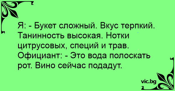 Официант: - Это вода полоскать рот. Вино сейчас подадут.