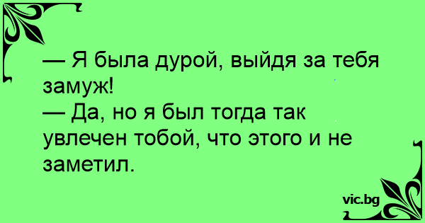— Я была дурой, выйдя за тебя замуж!<br />— Да, но я был тогда так увлечен тобой, что этого и не заметил.