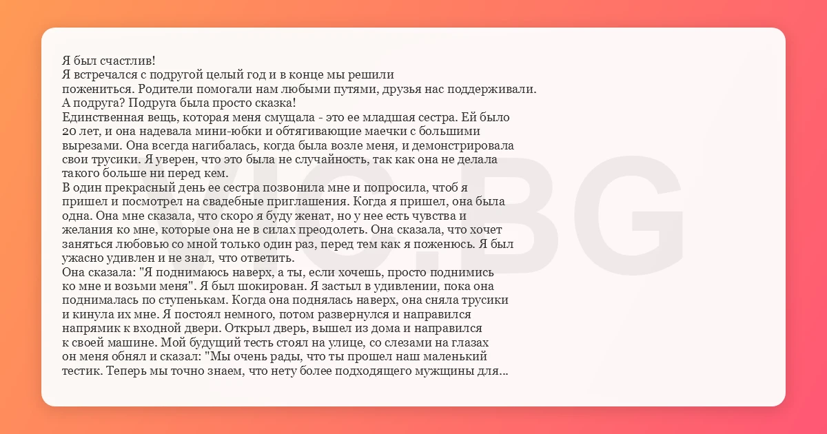 Я был счастлив! Я встречался с подругой целый год и в конце мы решили пожениться. Родители помогали нам любыми путями, друзья нас поддерживали. А подруга? Подруга была просто сказка! Единственная вещь, которая меня смущала - это ее младшая сестра. Ей было 20 лет, и она надевала мини-юбки и обтягивающие маечки с большими вырезами. Она всегда нагибалась, когда была возле меня, и демонстрировала свои трусики. Я уверен, что это была не случайность, так как она не делала такого больше ни перед кем. В один прекрасный день ее сестра позвонила мне и попросила, чтоб я пришел и посмотрел на свадебные приглашения. Когда я пришел, она была одна. Она мне сказала, что скоро я буду женат, но у нее есть чувства и желания ко мне, которые она не в силах преодолеть. Она сказала, что хочет заняться любовью со мной только один раз, перед тем как я поженюсь. Я был ужасно удивлен и не знал, что ответить. Она сказала: "Я поднимаюсь наверх, а ты, если хочешь, просто поднимись ко мне и возьми меня". Я был шокирован. Я застыл в удивлении, пока она поднималась по ступенькам. Когда она поднялась наверх, она сняла трусики и кинула их мне. Я постоял немного, потом развернулся и направился напрямик к входной двери. Открыл дверь, вышел из дома и направился к своей машине. Мой будущий тесть стоял на улице, со слезами на глазах он меня обнял и сказал: "Мы очень рады, что ты прошел наш маленький тестик. Теперь мы точно знаем, что нету более подходящего мужщины для нашей дочери! Добро пожаловать в нашу семью!" Мораль рассказа: Всегда оставляй презервативы в машине...