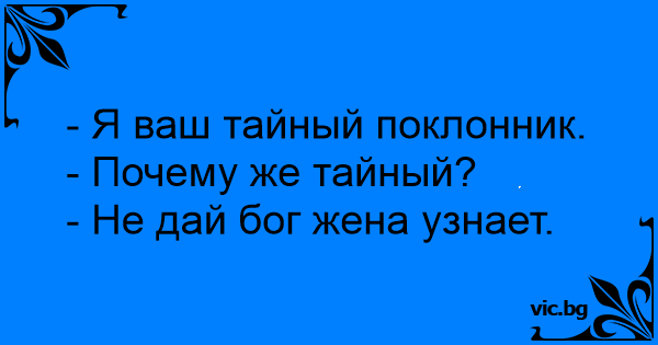 - Аз съм ви таен обожател! - Но защо таен?! - Ако жената разбере ....