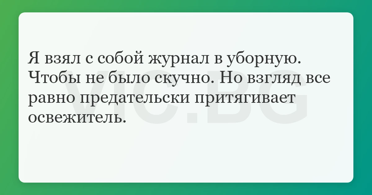 Я взял с собой журнал в уборную. Чтобы не было скучно. Но взгляд все равно предательски притягивает освежитель.