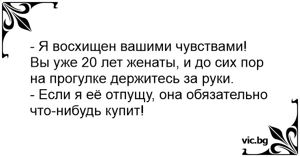 - Я восхищен вашими чувствами! Вы уже 20 лет женаты, и до сих пор на прогулке держитесь за руки.