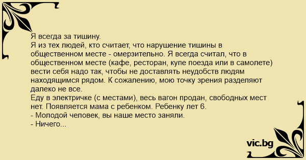 Я из тех людей, кто считает, что нарушение тишины в общественном месте - омерзительно. Я всегда считал, что в общественном месте (кафе, ресторан, купе поезда или в самолете) вести себя надо так, чтобы не доставлять неудобств людям находящимся рядом. К сожалению, мою точку зрения разделяют далеко не все.