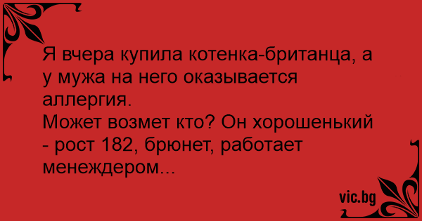 Я вчера купила котенка-британца, а у мужа на него оказывается аллергия.