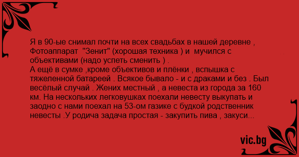 Я в 90-ые снимал почти на всех свадьбах в нашей деревне , Фотоаппарат "Зенит" (хорошая техника ) и мучился с объективами (надо успеть сменить ) .