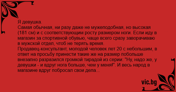 Я девушка. Самая обычная, ни разу даже не мужеподобная, но высокая (181 см) и с соответствующим росту размером ноги. Если иду в магазин за спортивной обувью, чаще всего сразу заворачиваю в мужской отдел, чтоб не терять время. Продавец-консультант, молодой человек лет 20 с небольшим, в ответ на просьбу принести такие же на размер побольше внезапно разразился громкой тирадой из серии: "Ну, надо же, у девушки - и вдруг нога больше, чем у меня!". И весь народ в магазине вдруг побросал свои дела и на меня уставился. Я не робкого десятка, но тут стало как-то некомфортно. И вдруг где-то у соседнего прилавка ехидный голос: - Что, обидно, когда даже у девушки больше?! Все как-то забыли про меня и уставились на консультанта. Обладателя голоса я не видела, но спасибо ему, спас от комплексов!
