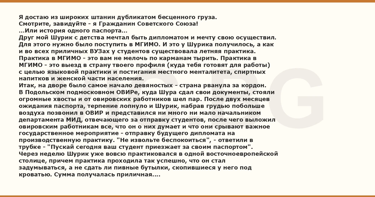 Я достаю из широких штанин дубликатом бесценного груза. Смотрите, завидуйте - я Гражданин Советского Союза! …Или история одного паспорта… Друг мой Шурик с детства мечтал быть дипломатом и мечту свою осуществил. Для этого нужно было поступить в МГИМО. И это у Шурика получилось, а как и во всех приличных ВУЗах у студентов существовала летняя практика. Практика в МГИМО - это вам не мелочь по карманам тырить. Практика в МГИМО - это выезд в страну твоего профиля (куда тебя готовят для работы) с целью языковой практики и постигания местного менталитета, спиртных напитков и женской части населения. Итак, на дворе было самое начало девяностых - страна рванула за кордон. В Подольском подмосковном ОВИРе, куда Шура сдал свои документы, стояли огромные хвосты и от овировских работников шел пар. После двух месяцев ожидания паспорта, терпение лопнуло и Шурик, набрав грудью побольше воздуха позвонил в ОВИР и представился ни много ни мало начальником департамента МИД, отвечающего за отправку студентов, после чего выложил овировским работникам все, что он о них думает и что они срывают важное государственное мероприятие - отправку будущего дипломата на производственную практику. "Не извольте беспокоиться", - ответили в трубке - "Пускай сегодня ваш студент приезжает за своим паспортом". Через неделю Шурик уже вовсю практиковался в одной восточноевропейской столице, причем практика проходила так успешно, что он стал задумываться, а не сдать ли пивные бутылки, скопившиеся у него под кроватью. Сумма получалась приличная. Однажды вечером в компании с аборигенкой, Шура решил посетить дискотеку. На входе их поджидал секьюрити и объявление "Вход лицам до 18 лет запрещен!". "Нет проблем!" - подумал Шура и протянул шкафу на входе свой паспорт. Шкаф его долго рассматривал, после чего заявил: "Камарад, дык ты еще не родился!". В паспорте на месте даты рождения нашего героя стояла дата годности паспорта - 96й год! Проблему утрясли - налицо очепятка. Потанцевали и забыли. А потом и практика подошла к концу. О паспорте своем Шура вспомнил дома, когда за отличную учебу его собрались отправить на стажировку не куда-нибудь, а в Финляндию. Причем выезд через три дня. Шура приуныл, но решил не сдаваться и поехал в родной подольский ОВИР. - Нет проблем, - сказала овировская тетька, выслушав суть проблемы, - Щас все устраним. И исчезла в недрах заведения. Через пять минут она вернулась и протянула Шуре его паспорт. Открыв его, он понял, что водку "Финляндия" придется покупать в своем универсаме, а финские блондинки остались необогретыми сиротками. Дата будущего рождения была жирно замазана канцелярскими белилами, а сверху ручкой была написана истинная дата рождения дип. мученника. - Это что такое, - только и смог он выдавить из себя. - Не стоит беспокоиться, - тетка дернула из рук Шурика паспорт и открыла последнюю страничку. Там красовалась надпись, сделанная каллиграфическим почерком: "Исправленной дате рождения верить" и подпись с печатью. - Да Вы че, я каждому погранцу буду объяснять, что нужно заглянуть на последнюю страничку? - возмущению будущего дипломата не было предела. - Нет проблем, - сказала тетька и опять исчезла с паспортом. Через минуту она вернулась. На первой странице паспорта появилась неуставная надпись: "См. стр. 22" Шуру начало трясти мелкой дрожью. Тетька сжалась, ожида