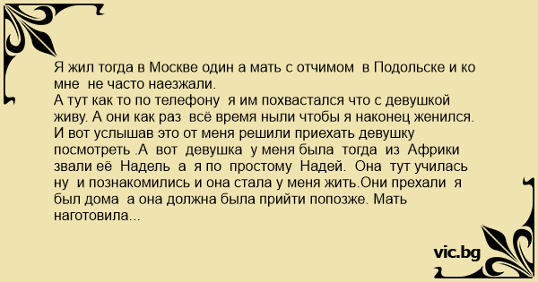 А тут как то по телефону я им похвастался что с девушкой живу. А они как раз всё время ныли чтобы я наконец женился. И вот услышав это от меня решили приехать девушку посмотреть .А вот девушка у меня была тогда из Африки звали её Надель а я по простому Надей. Она тут училась ну и познакомились и она стала у меня жить.Они прехали я был дома а она должна была прийти попозже. Мать наготовила чего то и с собой принесла. Мы с почти папашей уселись за стол по маленькой пропустили. Они у меня продвинутые мать учительница а отчим старый коммунист всё раньше за права негров боролся. Вот дверь хлопнула я пошел её встретить и мы с ней зашли в комнату где предки сидели за столомВидели бы вы их рожи мать побелела а папик огурчик видно кушал так он у него изо рта выпал прямо в тарелку Посидели они посидели и домой засобирались Мать мне