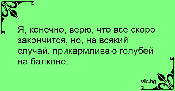 Аз не се съмнявам, че всичко скоро ще свърши, ама за всеки случай храня гълъбите на терасата.