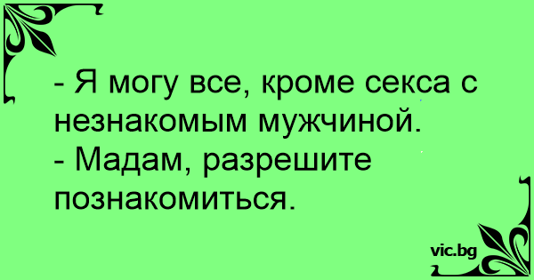 - Я могу все, кроме cekca с незнакомым мужчиной.<br />- Мадам, разрешите познакомиться.