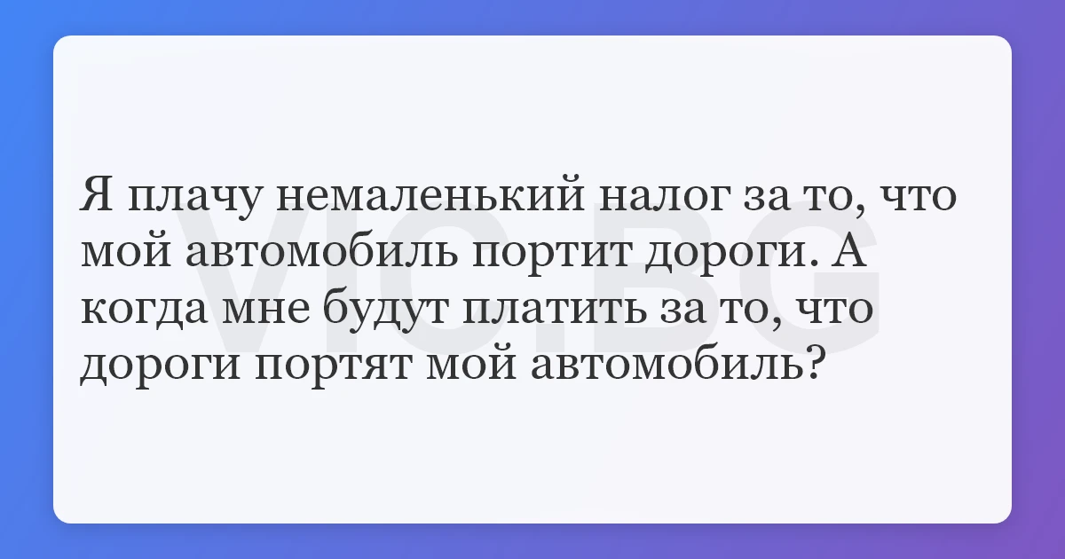 Я плачу немаленький налог за то, что мой автомобиль портит дороги. А когда мне будут платить за то, что дороги портят мой автомобиль?