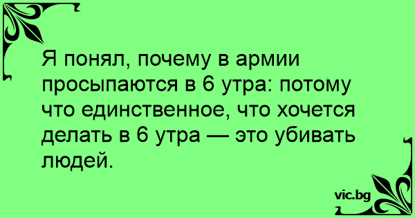Я понял, почему в армии просыпаются в 6 утра: потому что единственное, что хочется делать в 6 утра — это убивать людей.