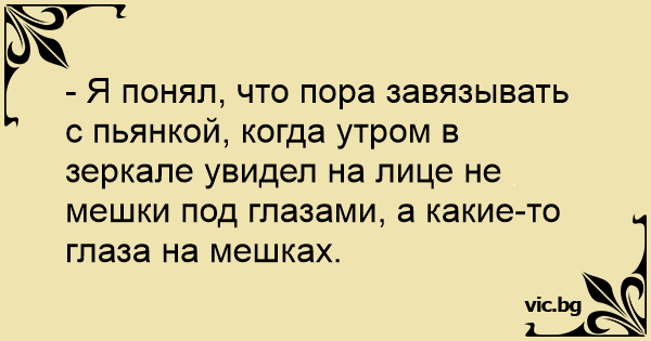 - Я понял, что пора завязывать с пьянкой, когда утром в зеркале увидел на лице не мешки под глазами, а какие-то глаза на мешках.