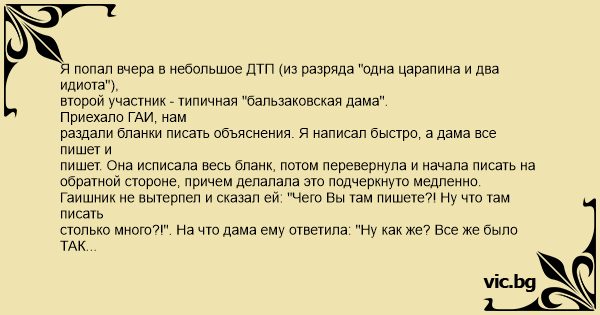 второй участник - типичная "бальзаковская дама". Приехало ГАИ, нам раздали бланки писать объяснения. Я написал быстро, а дама все пишет и пишет. Она исписала весь бланк, потом перевернула и начала писать на обратной стороне, причем делалала это подчеркнуто медленно. Гаишник не вытерпел и сказал ей: "Чего Вы там пишете?! Ну что там писать столько много?!". На что дама ему ответила: "Ну как же? Все же было ТАК эффектно, ТАК драматично!" Гаишник утерся и стал ждать. Дама дописала, Гаишник все прочитал и стал оформлять справки. Спросил меня где я живу и работаю - я ответил. Спрашивает у дамы место работы. Ответ - МГГУ, Литературный редактор. Теперь я точно знаю что профессия реально накладывает на людей свой отпечаток.
