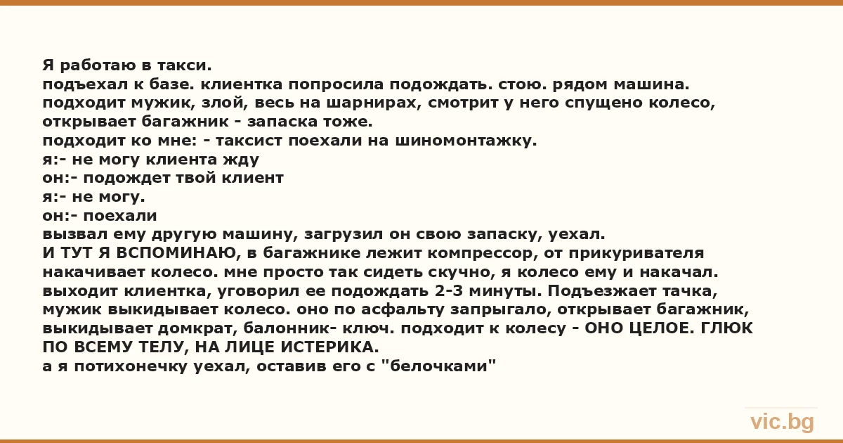 Я работаю в такси. подъехал к базе. клиентка попросила подождать. стою. рядом машина. подходит мужик, злой, весь на шарнирах, смотрит у него спущено колесо, открывает багажник - запаска тоже. подходит ко мне: - таксист поехали на шиномонтажку. я:- не могу клиента жду он:- подождет твой клиент я:- не могу. он:- поехали вызвал ему другую машину, загрузил он свою запаску, уехал. И ТУТ Я ВСПОМИНАЮ, в багажнике лежит компрессор, от прикуривателя накачивает колесо. мне просто так сидеть скучно, я колесо ему и накачал. выходит клиентка, уговорил ее подождать 2-3 минуты. Подъезжает тачка, мужик выкидывает колесо. оно по асфальту запрыгало, открывает багажник, выкидывает домкрат, балонник- ключ. подходит к колесу - ОНО ЦЕЛОЕ. ГЛЮК ПО ВСЕМУ ТЕЛУ, НА ЛИЦЕ ИСТЕРИКА. а я потихонечку уехал, оставив его с "белочками"