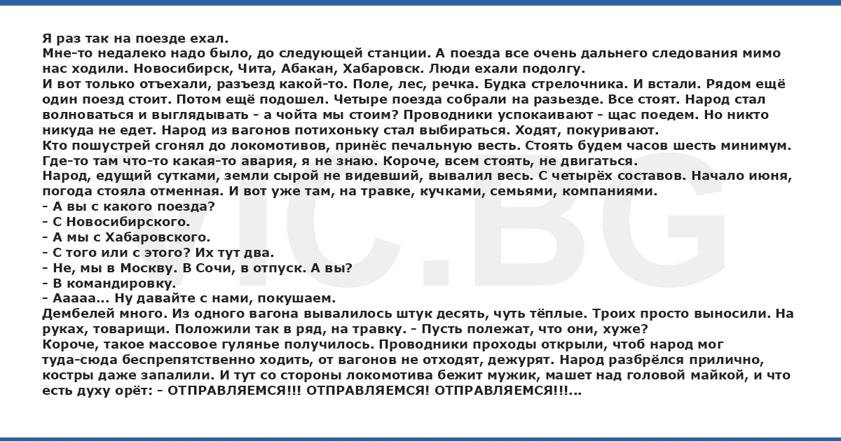 Короче, такое массовое гулянье получилось. Проводники проходы открыли, чтоб народ мог туда-сюда беспрепятственно ходить, от вагонов не отходят, дежурят. Народ разбрёлся прилично, костры даже запалили. И тут со стороны локомотива бежит мужик, машет над головой майкой, и что есть духу орёт: - ОТПРАВЛЯЕМСЯ!!! ОТПРАВЛЯЕМСЯ! ОТПРАВЛЯЕМСЯ!!!
