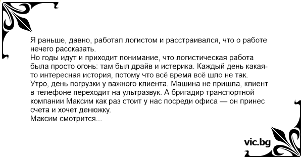 Я раньше, давно, работал логистом и расстраивался, что о работе нечего рассказать. Но годы идут и приходит понимание, что логистическая работа была просто огонь: там был драйв и истерика. Каждый день какая-то интересная история, потому что всё время всё шло не так. Утро, день погрузки у важного клиента. Машина не пришла, клиент в телефоне переходит на ультразвук. А бригадир транспортной компании Максим как раз стоит у нас посреди офиса — он принес счета и хочет денюжку. Максим смотрится чужеродно среди столов и бумаг, потому что похож на уголовника: ёжик на голове, глубокие морщины на лице, маленькие хитрые ярко-голубые глазки и хриплый пропитый голос. Дворовый сорокалетний пацан. Когда я сказал, что его водителя нет на погрузке, Максим сначала сделал движение губами, будто перекинул окурок из одного угла рта в другой, а потом — как будто разжевал этот окурок и проглотил. И позвонил водителю сам, отойдя в уголок офиса и отвернувшись. О чем говорили, было не слышно, пока Максим вдруг не заорал в трубку: — Что-о-о-о?! Бабу ты свою катал?!! Закончив внушение словами «Быстрее, бть!», Максим растерянно повернулся. Одновременно с ним весь офис развернулся к компьютерам и сделал вид, будто работает. Оказалось, вечером накануне погрузки водитель встретил свою любовь. Любите, девушки, простых романтиков — он усадил её в кабину фуры с полуприцепом и катал всю ночь по центру города Петербурга. Проносился длинным силуэтом по Дворцовой набережной, торжественно замирал на Стрелке Васильевского острова. Ну а потом, понятное дело, проспал. Вообще движение грузовиков по центру запрещено и мы бы остались без машины, но дуракам везёт и его никто даже не остановил.