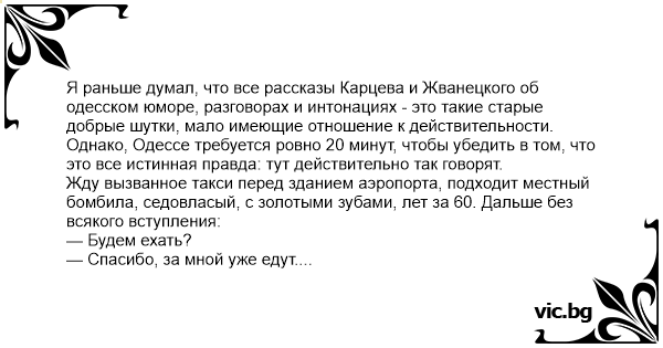 Я раньше думал, что все рассказы Карцева и Жванецкого об одесском юморе, разговорах и интонациях - это такие старые добрые шутки, мало имеющие отношение к действительности.