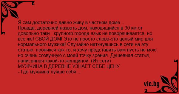 Правда, деревней назвать дом, находящийся в 30 км от довольно таки крупного города язык не поворачивается, но все же! СВОЙ ДОМ! Это не просто слова-это целый мир для нормального мужика! Случайно наткнувшись в сети на эту статью, проникся как то, и хочу представить вам пусть не мою, но очень созвучную с моей точку зрения. Душевная статья, написанная какой-то женщиной. (Из сети)