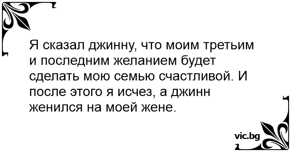 Я сказал джинну, что моим третьим и последним желанием будет сделать мою семью счастливой. И после этого я исчез, а джинн женился на моей жене.