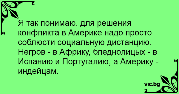 Я так понимаю, для решения конфликта в Америке надо просто соблюсти социальную дистанцию. Негров - в Африку, бледнолицых - в Испанию и Португалию, а Америку - индейцам.