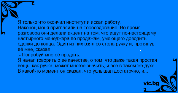 Наконец меня пригласили на собеседование. Во время разговора они делали акцент на том, что ищут по-настоящему настырного менеджера по продажам, умеющего доводить сделки до конца. Один из них взял со стола ручку и, протянув её мне, сказал: