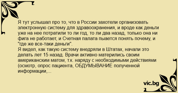 Я тут услышал про то, что в России захотели организовать электронную систему для здравоохранения, и вроде как деньги уже на нее потратили то ли год, то ли два назад, только она ни фигa не работает, и Счетная палата пыается понять почему, и "где же все-таки деньги".