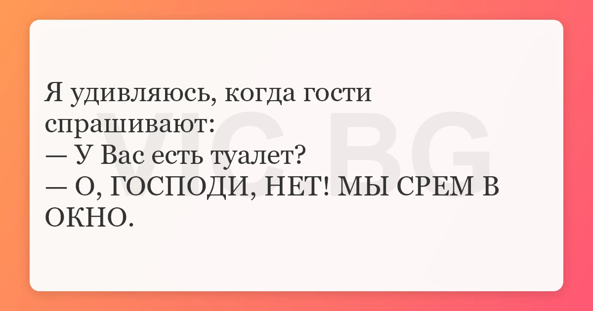 Я удивляюсь, когда гости спрашивают: — У Вас есть туалет? — О, ГОСПОДИ, НЕТ! МЫ СРЕМ В ОКНО.