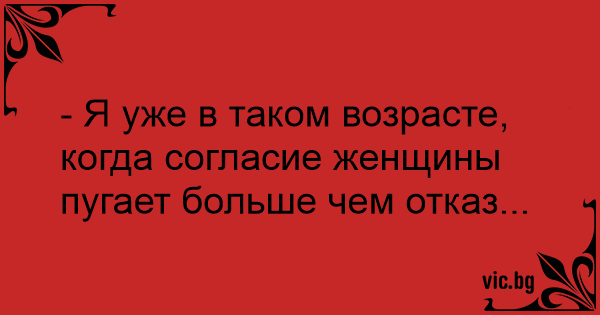 - Я уже в таком возрасте, когда согласие женщины пугает больше чем отказ...<br />