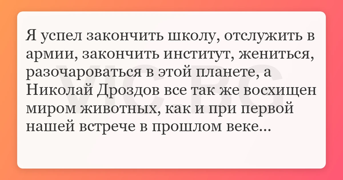 Я успел закончить школу, отслужить в армии, закончить институт, жениться, разочароваться в этой планете, а Николай Дроздов все так же восхищен миром животных, как и при первой нашей встрече в прошлом веке...