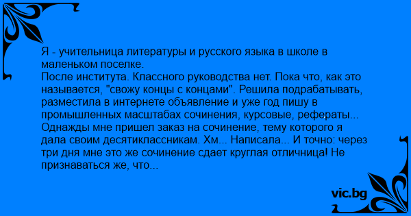 Я - учительница литературы и русского языка в школе в маленьком поселке. После института. Классного руководства нет. Пока что, как это называется, "свожу концы с концами". Решила подрабатывать, разместила в интернете объявление и уже год пишу в промышленных масштабах сочинения, курсовые, рефераты... Однажды мне пришел заказ на сочинение, тему которого я дала своим десятиклассникам. Хм... Написала... И точно: через три дня мне это же сочинение сдает круглая отличница! Не признаваться же, что сама писала? Поставила пять. Через месяц задаю им новое сочинение. Видимо, та отличница меня разрекламировала. Сваливается ДЕСЯТЬ заказов на сочинение по этой теме. Ну и что в итоге? Сама задаю сочинения, сама их пишу, сама проверяю. Детям на все пофиг. Школе пофиг тем более. А мне не пофиг, но я хочу нормально жить и есть. КМП.