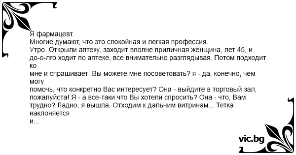 Утро. Открыли аптеку, заходит вполне приличная женщина, лет 45, и