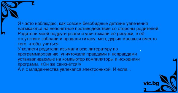 У коллеги родители изымали всю литературу по программированию, уничтожали правдами и неправдами устанавливаемые на компьютер компиляторы и исходники программ. «Он же свихнётся!»